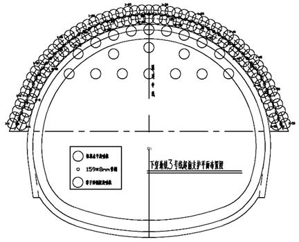 針對(duì)本工程下穿(深圳)地鐵3號(hào)線,暗挖隧道沉降控制高要求和現(xiàn)場(chǎng)地質(zhì)、水文、環(huán)境的實(shí)際情況,拱部采用“雙排水平旋噴帷幕+(帷幕間)159mm超前大管棚”綜合施工工法進(jìn)行超前與支護(hù),掌子面上臺(tái)階施做“水平旋噴錨固樁”進(jìn)行地質(zhì)改良、錨固。本支護(hù)里程為DK110+500~460,一次性支護(hù)長(zhǎng)度40米,水平旋噴+管棚綜合支護(hù);水平旋噴帷幕施工采用無(wú)線導(dǎo)向測(cè)控技術(shù),測(cè)量精度為0.1%,施工精度為0.5%;內(nèi)排旋噴樁在隧道開挖線外300mm布孔,外環(huán)旋噴樁在開挖線外800mm布孔,一次施工長(zhǎng)度40米,上仰1%角度預(yù)留施工誤差;設(shè)計(jì)水平旋噴樁樁徑600mm,環(huán)向孔間距400mm,環(huán)間距500mm,孔間搭接200mm,環(huán)間搭接100mm;掌子面施工水平旋噴試驗(yàn)樁和錨固樁,施工長(zhǎng)度和樁徑與拱部帷幕旋噴樁相同;暗挖隧道拱部水平旋噴樁咬合帷幕體中間施工超前大管棚,共同形成拱部超前支護(hù);管棚在開挖線外550mm布孔,鋼管管徑 159mm,厚度6mm,采用內(nèi)套管絲扣連接,連接扣長(zhǎng)不小于70mm,一次施工長(zhǎng)度為40米;超前大管棚采用有線導(dǎo)向測(cè)控,測(cè)量精度0.1%,施工精度為0.3%。
